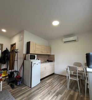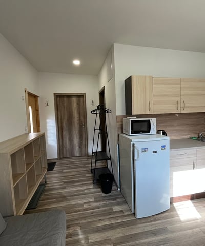 Chatka je vybavena vším potřebným pro pohodlný pobyt, včetně kuchyně, koupelny a útulného obývacího prostoru.